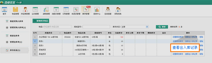 3.查看出入库记录:点击主界面上方的“库存管理”菜单,选择左侧第五行“库存信息”菜单,点击主列表右侧的“查看出入库记录”。如下图: