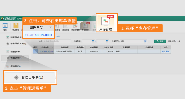 点击主界面上方的“库存管理”菜单,选择左侧第四行“管理出库单”菜单,点击出库单号进入出库单查看页面。如下图: