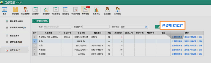 2.设置期初库存:点击主界面上方的“库存管理”菜单,选择左侧第五行“库存信息”菜单,点击主列表右侧的“设置期初库存”。如下图: