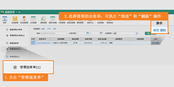 3.修改/删除出库单:点击主界面上方的“库存管理”菜单,选择左侧第四行“管理出库单”菜单,如下图: