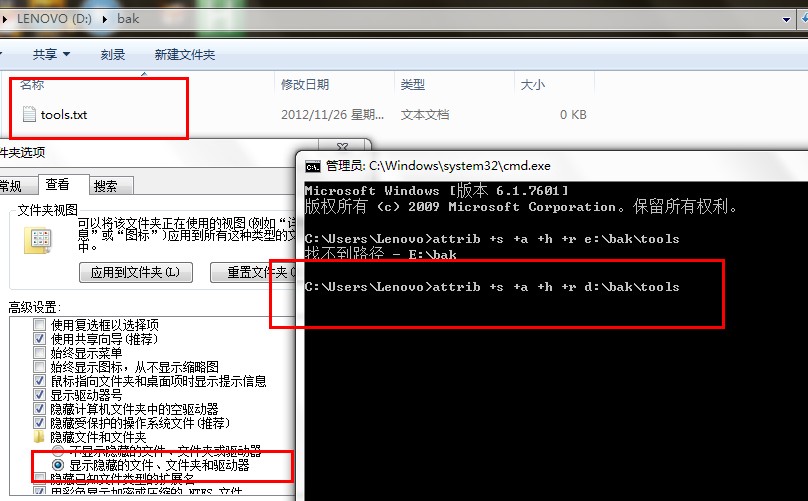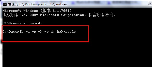 2.键入:attrib +s +a +h +r e:\bak\tools