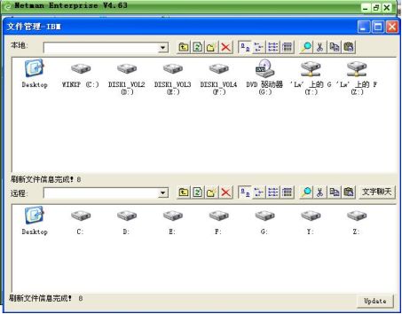 该功能针对个别电脑进行操作和管理。选择文件管理功能,弹出双方硬盘基本信息对话框。界面的上半部分显示本地硬盘的基本资料,下半部分则显示远程电脑硬盘的基本资料。选择所要传输的文件或文件夹,拖拽到目标文件夹就能实现文件的上传下载,软件支持断点续传。软件还有许多快捷实用的功能按扭和右键弹出菜单功能。