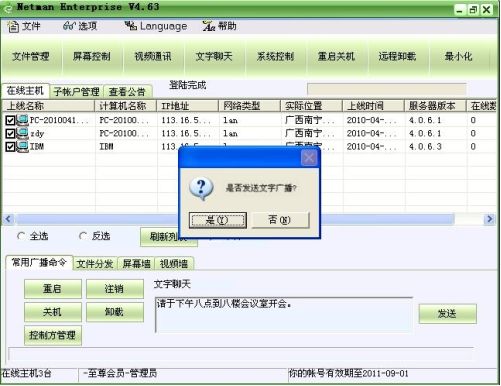 在“文字聊天”中输入消息内容,发送,软件弹出确认信息,点击“是”,则发送广播信息。发送完毕,电脑屏幕右下角弹出信息发送完毕的提示。
