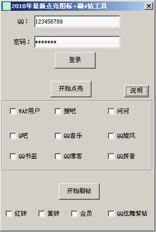 近日一个名为“2010年最新点亮图标+刷4钻”的外挂工具借免费给用户刷钻及点亮QQ图标为由诱骗用户QQ账号及密码以此盗取很多QQ账号。这个“QQ密码收集器”盗号木马很是猖狂。QQ电