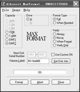 AlkonostMaxFormat是一款专门用来格式化软盘的好工具,除了可以将软盘格式化成1.44MB、1.2MB等标准格式外,最大的特色是能够将3.5英寸的软盘格式化成1.72MB、1.68MB等非标准格式,或