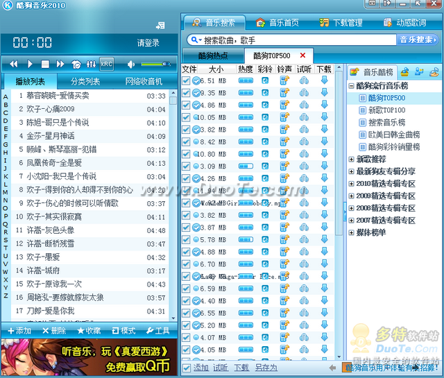 玩转酷狗音乐随时随地听歌:随时随地听音乐,还能把歌曲复制到随身听(支持iPod、iPhone、音乐手机及普通mp3播放器)酷狗音乐就可以。酷狗音乐下载地址:http://www.jfsky.com/SoftView/Sof