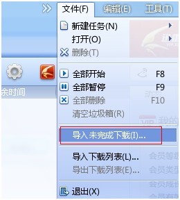 1、打开“文件”菜单,选择“导入未完成下载” 2、在弹出的窗口中,找到你需要导入的任务,然后单击鼠标左键选中,在点击“打开”即可开始导入。(若文件较大,则导