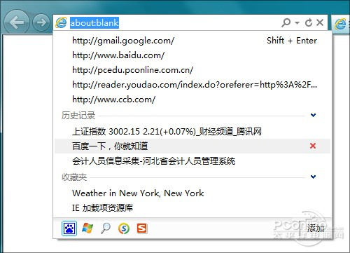 ie9新功能之智能地址栏 在IE9中地址栏与搜索栏合二为一,这意味着我们可以直接从地址栏中输入关键词实现搜索。 此外在它的下拉菜单中,收藏夹、历史记录也都拥有一席