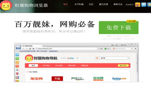 12月6日,专业购物浏览器公司财猫宣布,公司将在近期正式推出全新2.0产品,该产品定位购物,特别为女性用户打造,是第一款专门为购物人群打造的浏览器!从财猫官方了解到,