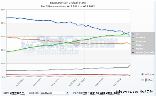美国市场研究公司Statcounter的最新数据显示,在全球浏览器市场,Chrome已经超越IE,成为第一大浏览器。5月,Chrome的全球份额约为33.69%,首次超过了IE的29.91%。Firefox比较平稳,全球份额约