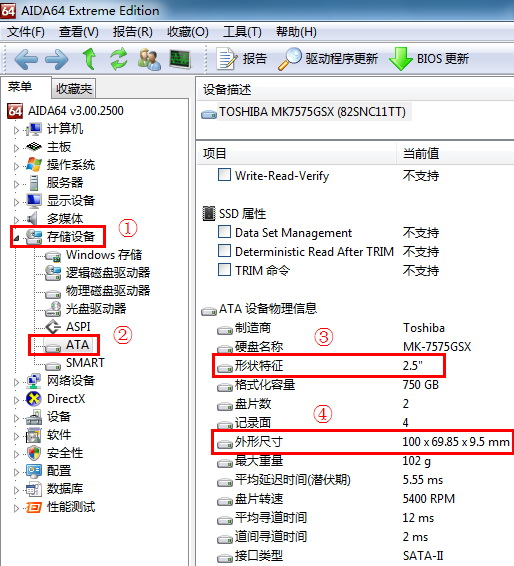 双击“AIDA64”图标,运行该程序后,点击“存储设备”-“ATA”,在右侧就会显示出此设备的详细信息,“形状特征”表示硬盘尺寸,“外形尺寸”表示硬盘大小与厚度