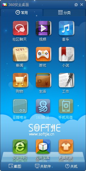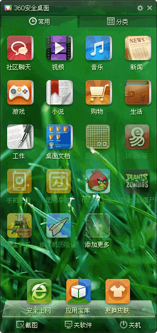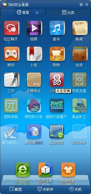 360安全桌面整合了“社区聊天、视频、音乐、新闻、游戏”等日常必备软件,主要包含以下功能:1.自动整理归类已安装的软件和常用网址;2.一键安装应用,快速启动应用;