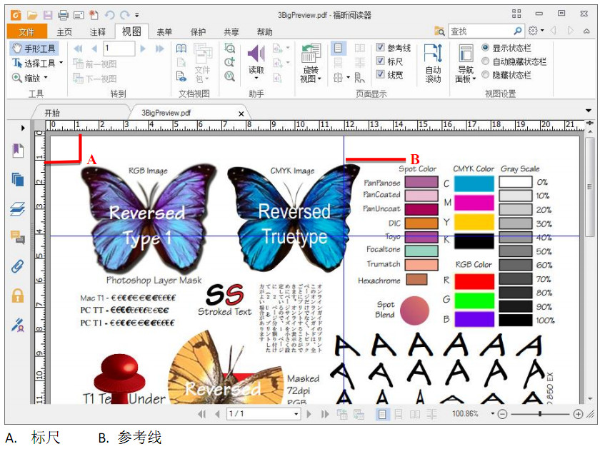 福昕阅读器提供水平和垂直标尺和参考线工具(点击“视图”>“页面显示”>“标尺”和“参考线”),可以帮助您调整页面上的文本、图像或其他物体的位置,也可以检查图像的尺寸大小