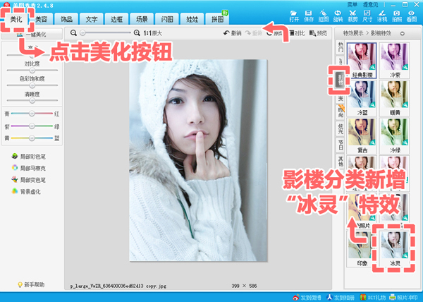 功能再升级美图秀秀2.4.8正式版闪亮登场上个版本的热浪还未散尽,美图秀秀2.4.8正式版又闪亮登场了。新版美图秀秀新增了“冰灵”影楼特效,并对上一版本推出的照片拼接功能进行了