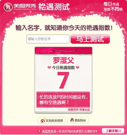 相信缘分吗?还在寻找另一半的TA吗?前世五百次的回眸不一定能换来今生的一次擦身而过,很多缘分是冥冥之中注定的,来看看你今年的缘分吧,大家都在玩哦!操作很简单,如下图: