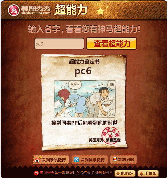 你有什么能力呢?赶快来测试一下吧!测试地址:http://8.app.meitu.com 美图秀秀超能力是一款超有意思的在线应用测试!不用惊叹,你也可以来测测,说不定你的超能