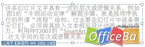 许多幻灯片文字具有一定的层次或逻辑关系,例如图1的“牛顿运动定律”解题步骤,就是按顺序执行的所谓“流程”结构。过去要在幻灯片中逐条展示它们,必须将其放入文本框后设计