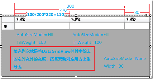 在WinForm中,将DataGridView控件的列的AutoSizeMode属性设置为Fill,然后将FillWeight属性设置为列宽所占的权重,这样可实现列宽自动填充列,下图说明自动填充宽度的