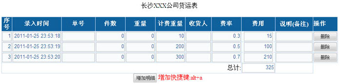 图(1.1)某物流信息系统中的功能要求如图1.1所示,表格中每一行代表一笔运送货物的信息,在录入每行的计费重量和费率后,要求能按一定的公式,自动计算运送费用,并且能自动统计所有运
