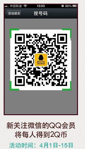 体QQ会员用户又有福利啦!即日起-4月15号只要新添加关注QQ电影票的微信公众号,就可以百分百获得2QB的奖励哟!如果你是QQ的普通用户也不要失望,通过收听转发活动微博也是有机会获