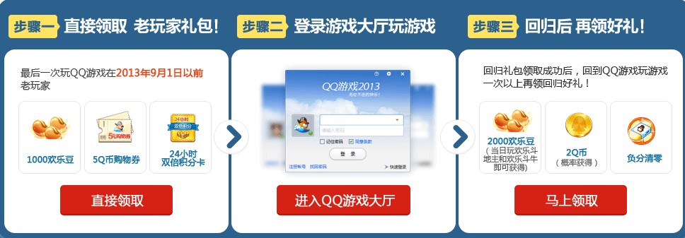 最近滴QQ福利活动咋都这么给力捏?只要你最后一次登陆qq游戏大厅在9月1号前的老玩家,就可以直接领取1000欢乐豆和5Q币购物券,当进入游戏后还可再领2000欢乐豆和负分清零资格,以及