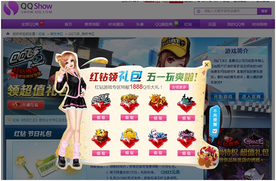 活动说明: 1、红钻游戏专区:红钻和QQ飞车游戏特权专区(长期专区)。 2、红钻用户专享QQ飞车游戏礼包,只有红钻可以领取。 3、具体礼包内容: 礼包1:QQ飞车五一