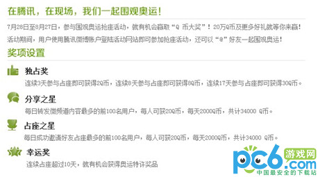 围观奥运连续17天参与送30Q币哦,只要你们每天在微博上关注一下奥运信息,就有可能赢得30Q币,这么容易的好事我们应该去分一杯羹了,一起来看看详细资讯坚持3天2Q币最高17天30Q币。