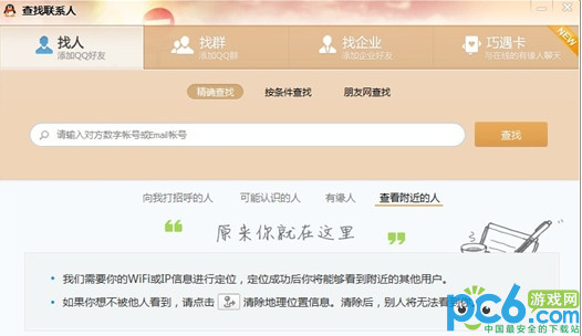 新功能是不是很强悍,快来参加体验吧!腾讯体验中心推出QQ2012新功能“查找附近的人”试用邀请,该功能可以通过IP定位及wifi定位,为您搜寻到在你附近的QQ用户,体验详情:1.点击“