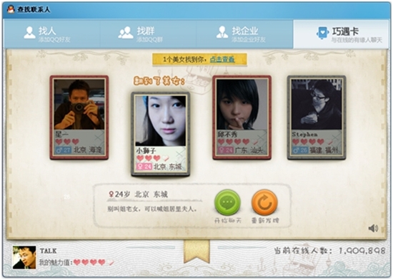 “浮生若梦谁飞寄、萍水相逢亦因缘。”腾讯体验中心日前推出了新增巧遇卡功能的QQ2012体验计划,该功能可以让你与QQ在线的有缘人进行聊天,体会缘分的魅力。体验时间:2012年4月