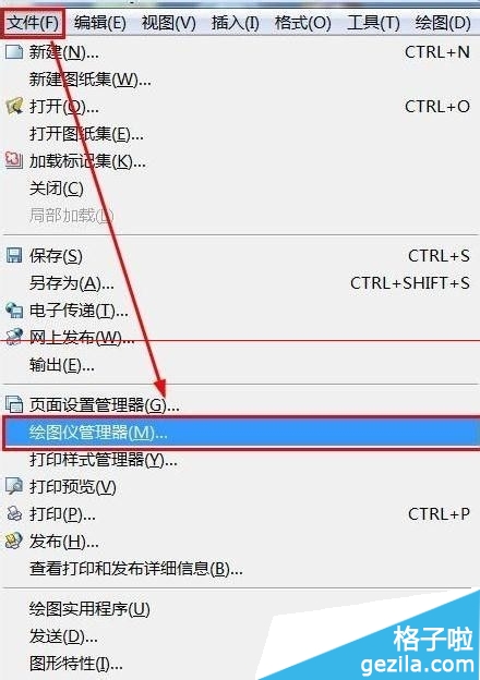 2、选择点文件---绘图仪管理器,双击他就打开另外一个窗口