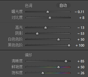 先看颜色,为了提高质感,把高光压低,黑色色阶调到最高,白色色阶调到50,阴影调整到-53,清晰度方面,拉高到85,饱和度降低,为了整体颜色氛围,我们还要把鲜艳度调整到50。参考数值如下。