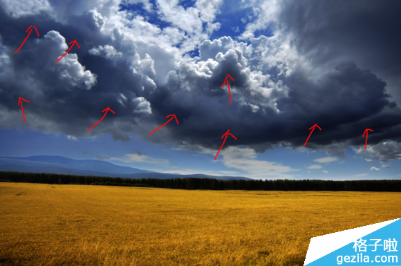 最后使用白色画笔工具,以0%硬度、200PX大小和80%透明度在图中箭头位置涂擦,以增加云层的层次感