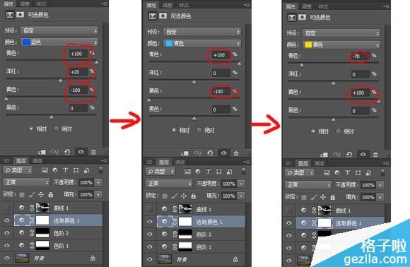 创建一个可选颜色调整层,分别依次对蓝色、青色、黄色进行如图参数调节,其中蓝色和青色可以影响天空的颜色,调后天空更加壮美;而黄色影响麦田