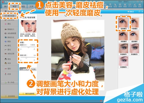 2、点击“美容” “磨皮祛痘”,先使用一次“轻度磨皮”降除噪点,再调节磨皮画笔的力度和大小,对照片背景进行虚化处理,以此突出人物。