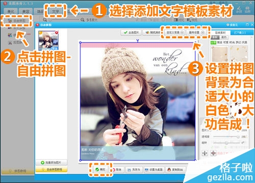 6、最后还可以点击“文字” “文字模板”添加合适的文字素材。并使用“拼图” “自由拼图”给照片添加白色拼图背景边框。