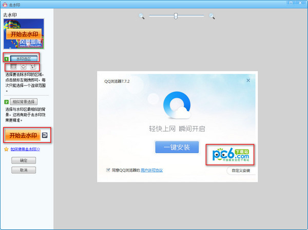 第三步:在去水印的界面选择去水印的区域,点击右边“1”,选择矩形框或者圆形框,或者是自定义,选择好以后点击“开始去水印”,然后等待即可
