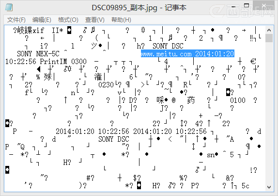 打开“记事本”,将照片拖到记事本中,会有一堆乱码呈现在你面前。仔细看就会发现一些端倪。