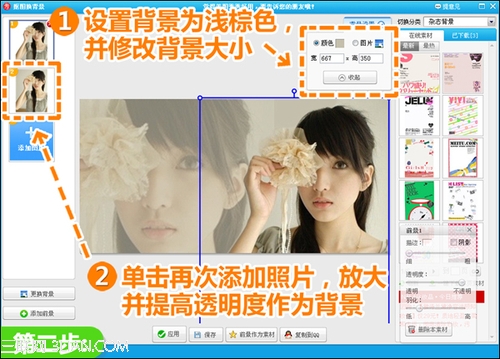 2、在“抠图换背景”界面,点击“背景设置”按钮,将背景画布设置为浅棕色,再调整背景大小;点击“添加图片”,将原图作为背景加入,放大并适当调高透明度。