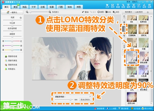 3、回到“美化”菜单,点击“LOMO”特效分类,使用一个透明度为90%的“深蓝泪雨”特效,为图片营造清新感。