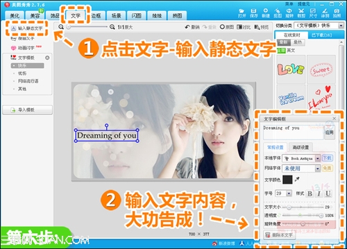 6、最后点击“文字—输入静态文字”,将自己想要表达的心情输入,就大功告成啦!