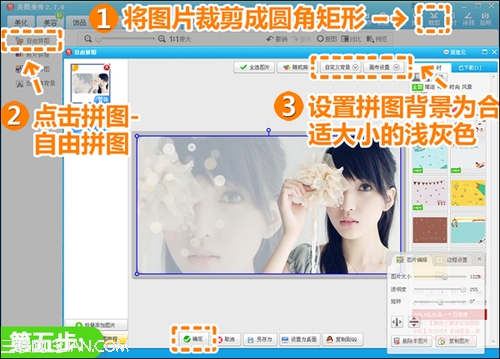 5、点击“裁剪”按钮,勾选“圆角裁剪”,将图片裁剪成圆角矩形,再点击“拼图—自由拼图”,给图片添加浅灰色背景框。