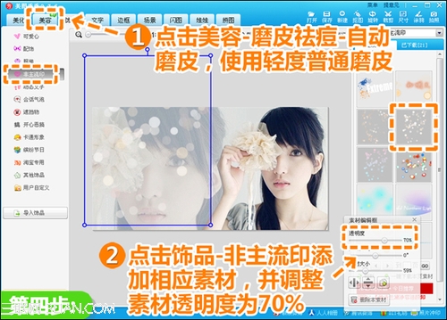 4、进入“美容”菜单下,点击“磨皮祛痘”按钮,选择“自动磨皮—普通磨皮—轻”;然后再点击“饰品—非主流印”,添加透明度为70%的光点素材,让图片更加唯美柔和。