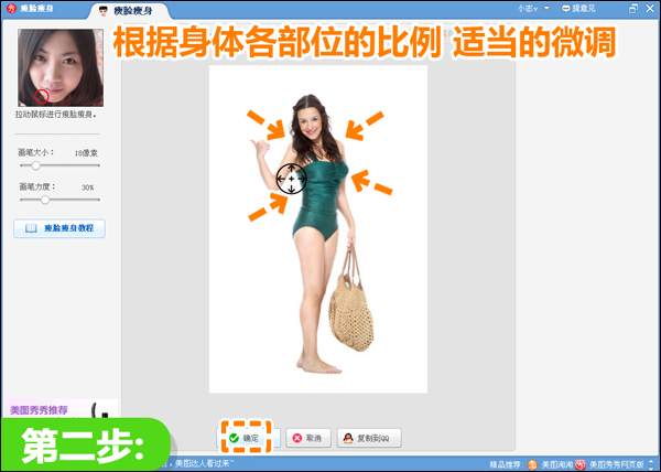1、在“美图秀秀”软件下,进入“美容”菜单下选择“瘦身瘦脸”功能,用合适的画笔大小力度,将身体微胖的部位向内推。