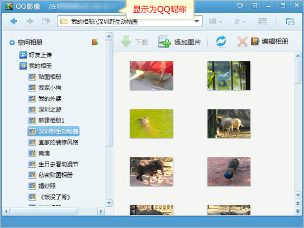 登录成功后在左上角会显示QQ昵称,并且空间相册内的图片也会一并同步,如图: