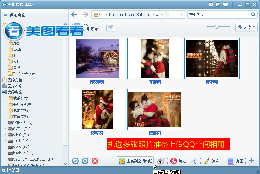 要和好友网络分享照片,现在流行的做法就是拼接多张照片,再通过微博或QQ空间分享出去。美图看看这款小巧的看图工具,也带有非常方便的拼图功能。