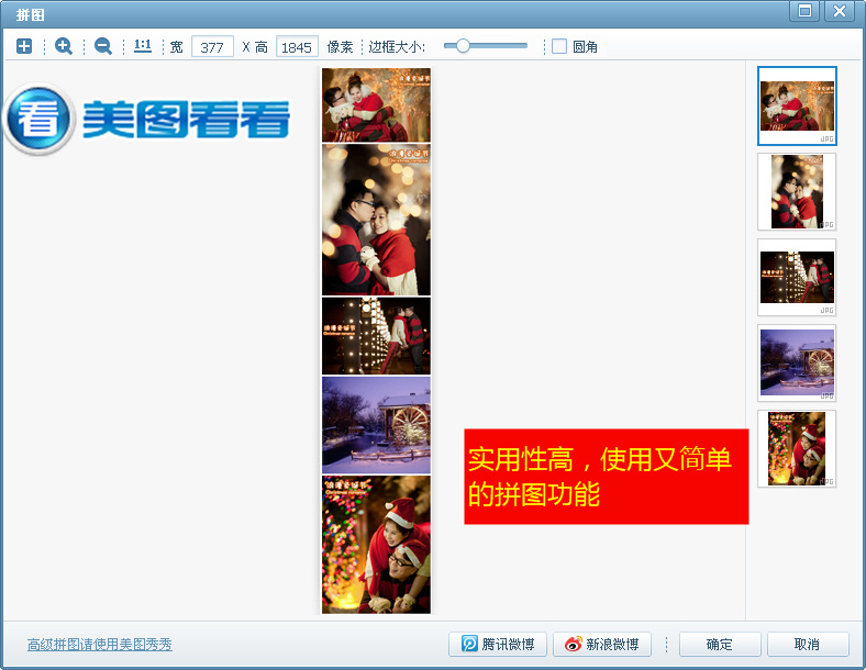 在软件主界面右方选择原图片,单击右下角“拼图”按钮,即可进入如图02所示拼图功能窗口。美图看看提供了几个相对实用的编辑选项,比如再添加其他照片进来、定义拼图尺寸大小和边框大小等;最重要的是,通过美图看看还可一键叫起美图秀秀(国内主流的图片美化工具),来实现更多效果的照片美化操作;软件还提供了拼图微博分享功能,一键即可将当前拼图效果通过腾讯微博或新浪微博分享出去!