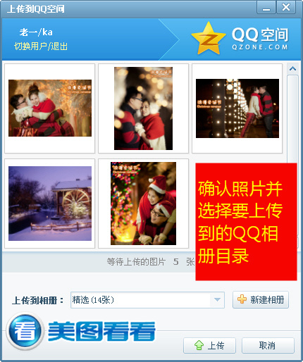 随后,美图看看会引导用户以自己的QQ号码登陆到QQ空间;完成登陆后即会进入上传到QQ空间的操作窗口,如图04所示。在这里确认好要上传的照片,选择好QQ空间的相册目录,单击“上传”按钮就搞定啦!