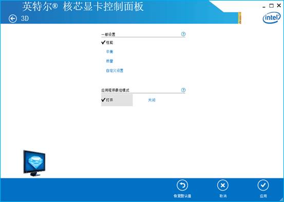 2. 3D界面,里面有一般设置和应用程序最佳模式,可以选择,如图: