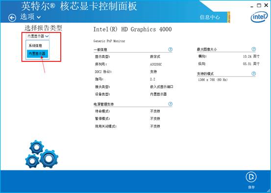 信息中心可以选择报告类型,上图默认是系统信息,下图选择内置显示器,界面如下: