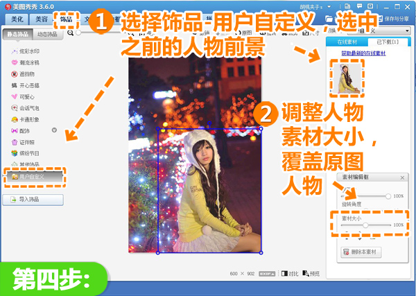 4、进入“饰品”菜单,选择“用户自定义”分类,选中之前保存的人物前景,设置大小使其与原图人物完全重合。